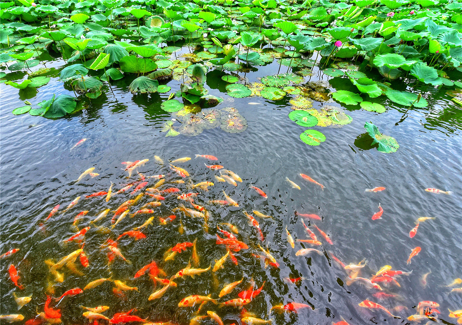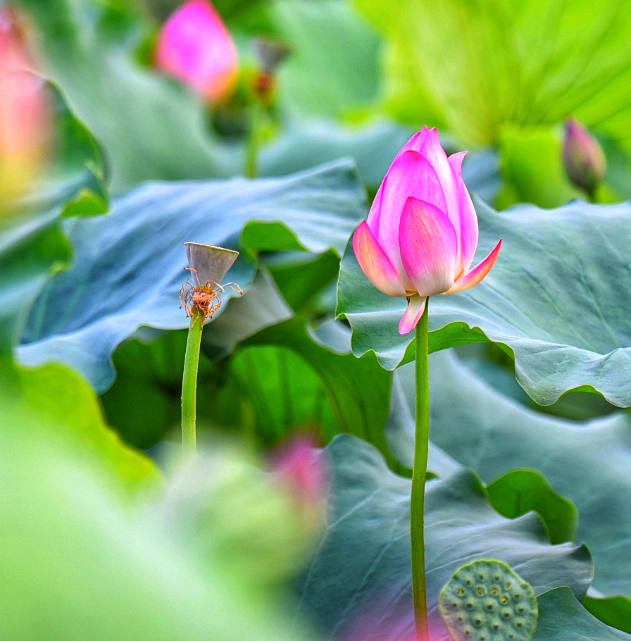 炎炎夏日,荷花盛开季,朵朵荷花风姿绰约,片片荷叶迎风摇摆,淡雅的香气扑鼻而来。青荷盖碧水,芙蓉披红鲜。鱼戏荷叶间,荷香飘九江。盛开的荷花与大自然相映成趣,构成了盛夏一道清新的美景。